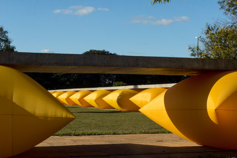 Estrutura Volátil (Volatile Structure), 2011/2024 Eixo Monumental de Brasília – Brasília - Brasil Monumental Axis of Brasilia – Brasilia – Brazil Nylon (tecido) e motor acoplado. Nylon (fabric) and coupled motor. 600 x 600 x 230 cm (x 32 unidades) 236.2 x 236.2 x 90.6 in (x 32 units)